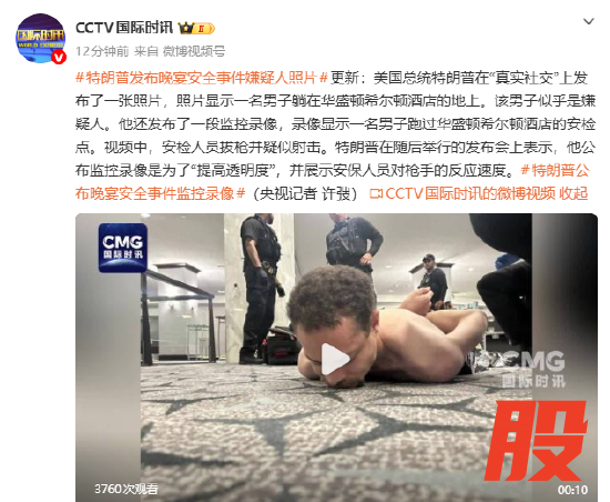 美国总统特朗普在“真实社交”上发布了一张照片,照片显示一名男子躺在华盛顿希尔顿酒店的地上。该男子似乎是嫌疑人。他还发布了一段监控录像,录像显示一名男子跑过华盛顿希尔顿酒店的安检点。视频中,安检人员拔枪并疑似射击。特朗普在随后举行的发布会上表示,他公布监控录像是为了“提高透明度”,并展示安保人员对枪手的反应速度。