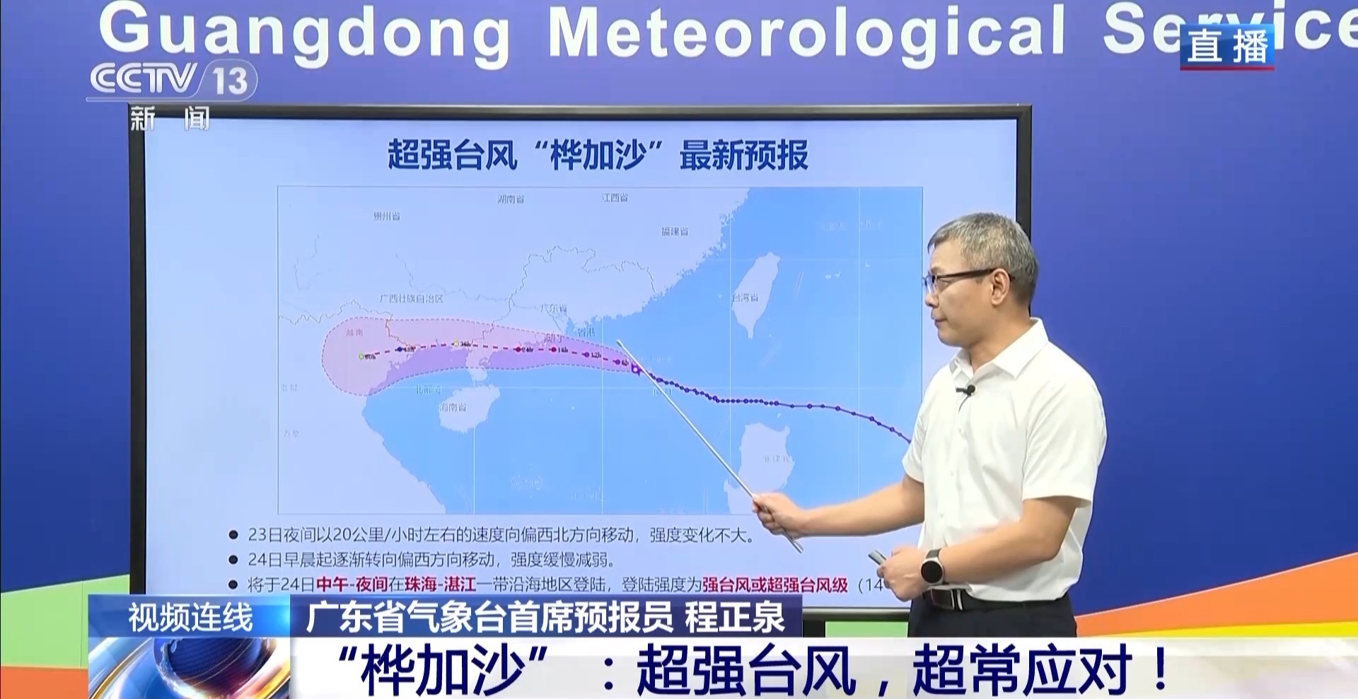 程正泉:预计它在23日晚上仍然以20公里左右的时速向偏西北方向移动,会逐渐逼近珠江口,在24日早晨转向偏西行。我们预计它将在24日中午到夜间,在珠海到湛江一带沿海地区登陆。同时“桦加沙”也存在随时登陆的可能,甚至多次登陆的情况。