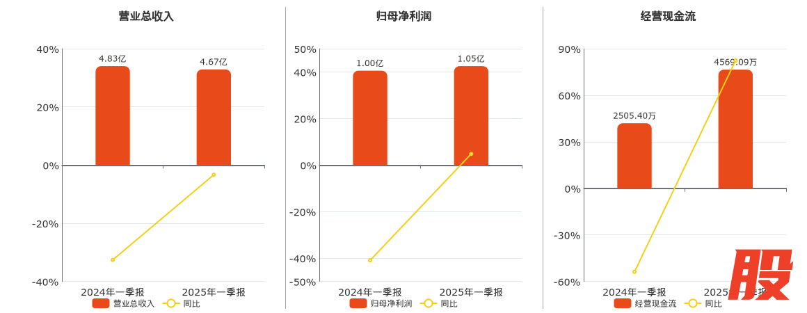 公司营业总收入为4.67亿元,较去年同报告期营业总收入减少1601.49万元,同比较去年同期下降3.32%。归母净利润为1.05亿元。经营活动现金净流入为4569.09万元。
